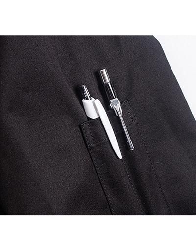 エーモント製品の中でも人気のあるスリムシェフウェアラインの新商品でよりカジュアル、そしてオシャレに再デザインされました。 高級コットンスパン混紡生地で、身体にフィットしながらも伸縮性と、コットン混用率が高く吸汗性に優れています。 左スリーブ上部にはボールペンや温度計など小道具を収納できるポケットがあり従来品より機能性を高めたシェフウェアです。 |